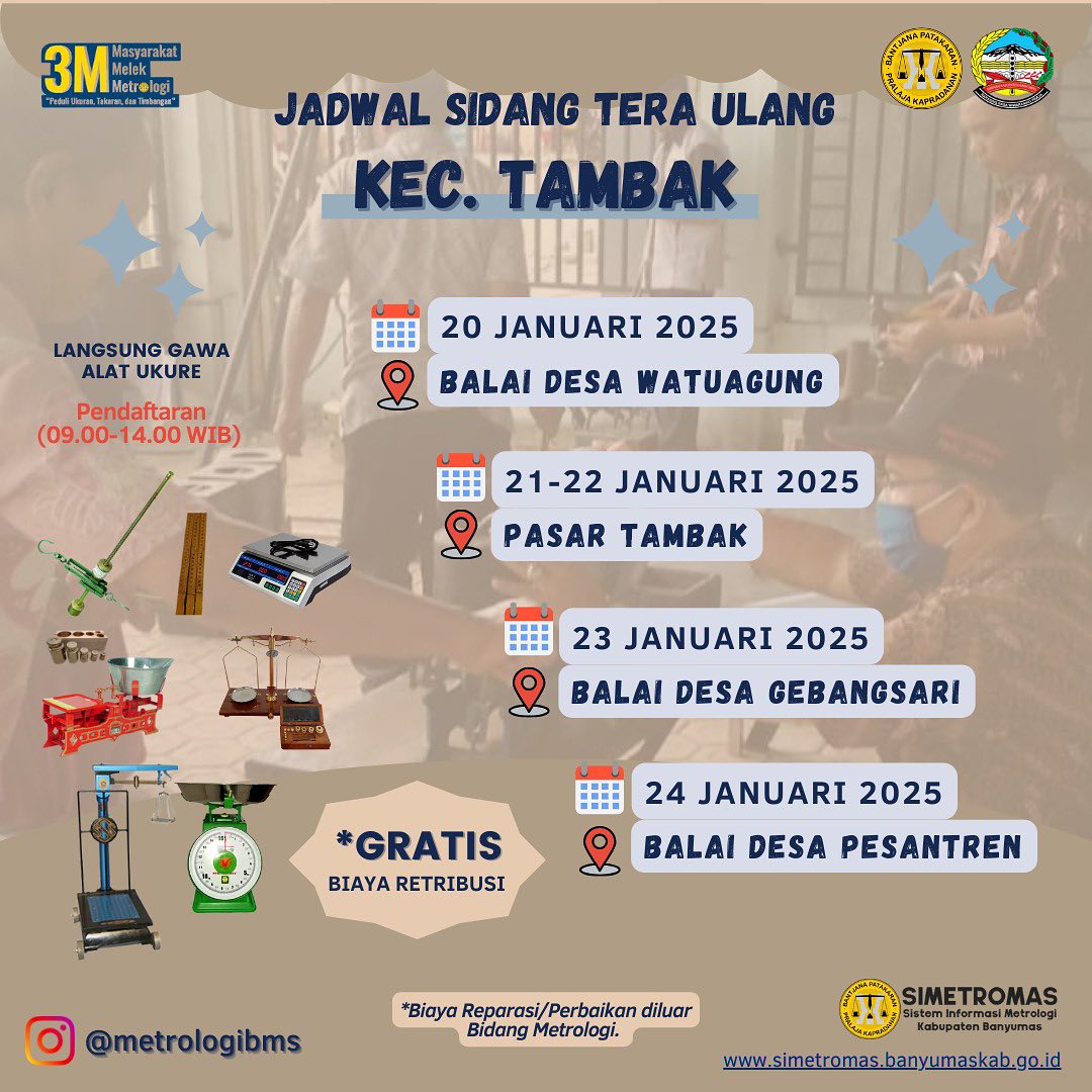 *Jadwal Sidang Tera Ulang**Kec. Tambak*ð 20 Januari 2025ð Balai Desa Watuagungð 21-22 Januari 2025ð Pasar Tambakð 23 Januari 2025ð B...